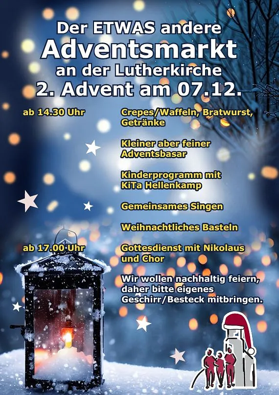 Wir freuen uns über die zahlreichen Besucherinnen und Besucher des diesjährigen Adventsmarktes am 2. Advent. Bei Kerzenschein und in gemütlicher Stimmung wurde gemeinsam geplaudert, gebastelt, gesungen und die Leckereien, wie Waffeln, Crêpes und Bratwurst, sowie Punsch und Glühwein genossen. Viele schöne Bastel- und Näharbeiten, selbstgemachte Marmelade und Kekse konnten erworben werden. Höhepunkt für die Kinder war sicher der Besuch des Nikolauses in dem fröhlichen Adventsgottesdienst, den wir gemeinsam gefeiert haben, und der auch von unserem Kirchenchor musikalisch bereichert wurde. Wir danken allen Helferinnen und Helfern von der Gemeinde und dem Kindergarten Hellenkamp ganz herzlich, die diesen schönen Nachmittag möglich gemacht haben.