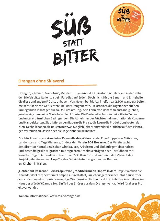 Auch in diesem Jahr gibt es wieder die leckeren, fair gehandelten und ökologisch produzierten Orangen aus Rosarno.