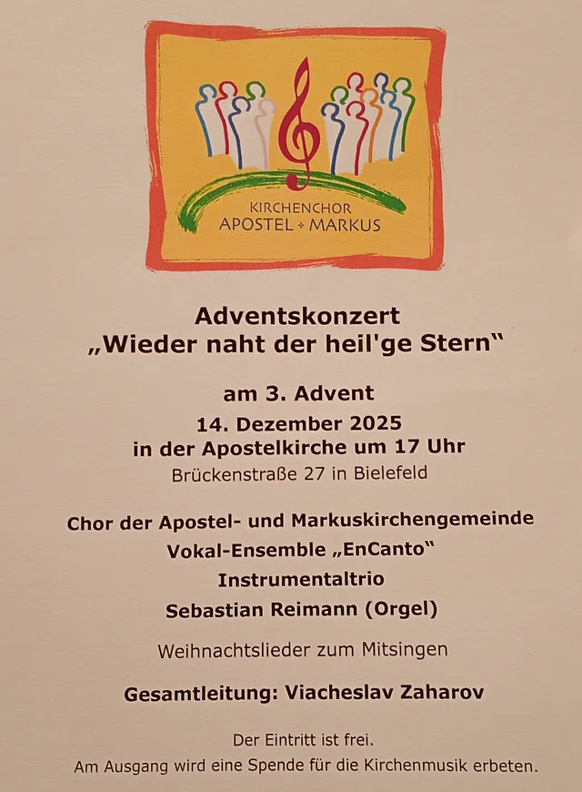 Am Sonntag, den 15.12.2024, fand das traditionelle Adventskonzert des gemeinsamen Kirchenchores von Markus und Apostel in der Apostelkirche statt. Der Chor unter der Leitung von Viacheslav Zaharov begeisterte das Publikum mit Liedern und der Pastoralmesse in C-Dur (Chriskindlmesse) von Ignaz Reimann. Mehrere Musikgruppen gaben dem Konzert einen festlichen Rahmen. Es spielten das Flötenquartett "Coroenchen" unter der Leitung von Heike Brünger, der Bläserkreis der Apostel-Gemeinde unter der Leitung von Maria von Haebeler und ein Instrumentaltrio bestehend aus Querflöte (Wiebke Findeisen), Cello (Carola Poly) und Klavier (Gisela Scholz). Bei den gemeinsamen Liedern, die von allen Auftretenden und dem Publikum gemeinsam gesungen wurden, wurde die Weihnachtsfreude für alle erlebbar.
